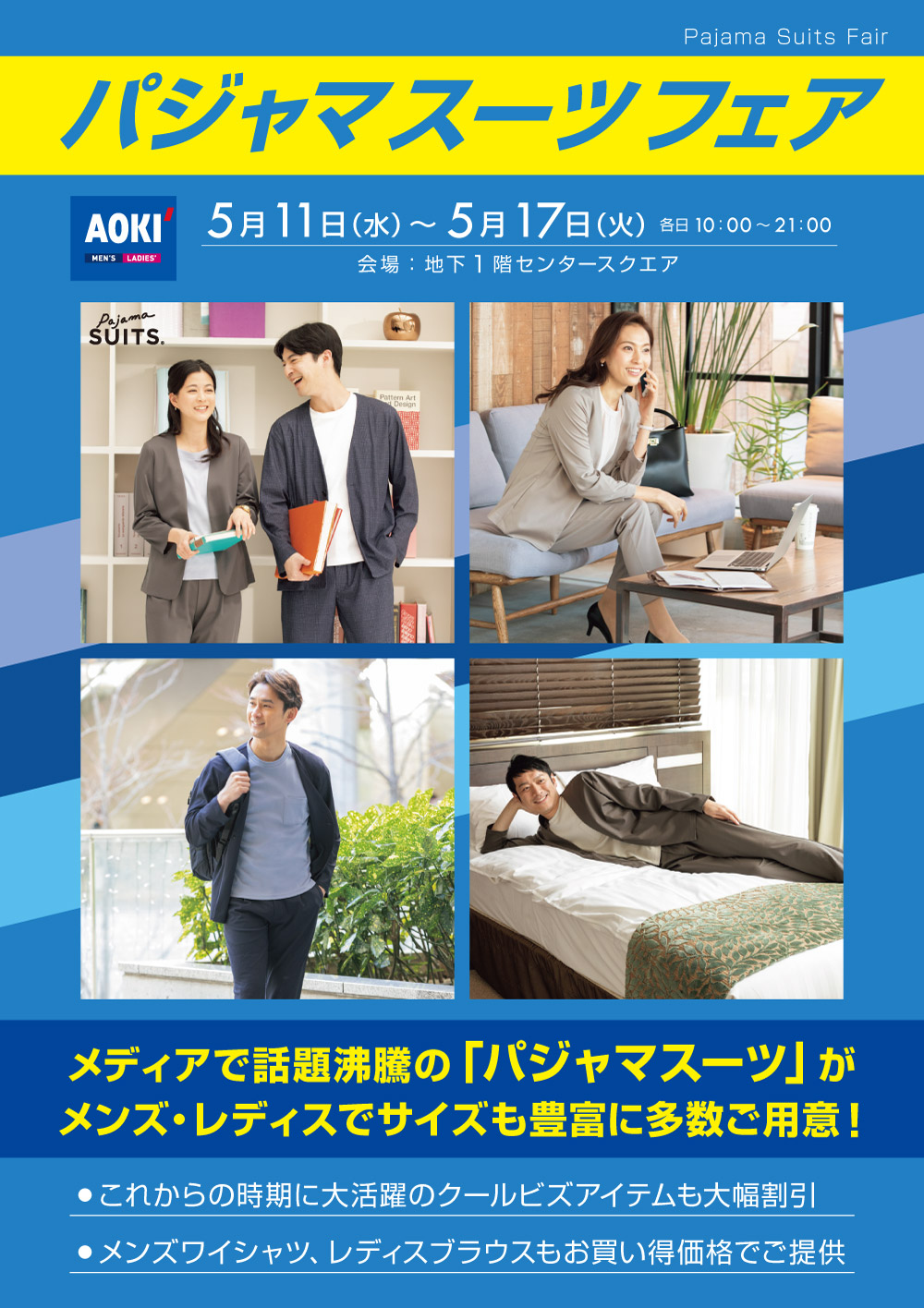 AOKI『パジャマスーツフェア』開催のご案内 2022.05.11~2022.05.17 5月11日(水)~17日(火)の期間 地下1階センタースクエアにて AOKI『パジャマスーツフェア』を開催いたします。 ビジネススタイルとしても定着している『パジャマスーツ』 リラックス感のある素材でありながらもスタイリッシュに着こなせる パジャマスーツのバリエーションやコーディネートもあわせてご紹介! 期間中はビジネスアイテムのお買い得品もご用意いたします。 ぜひお立ち寄りくださいませ!! SNSでシェアする Tweet Tweet 一覧へ戻る