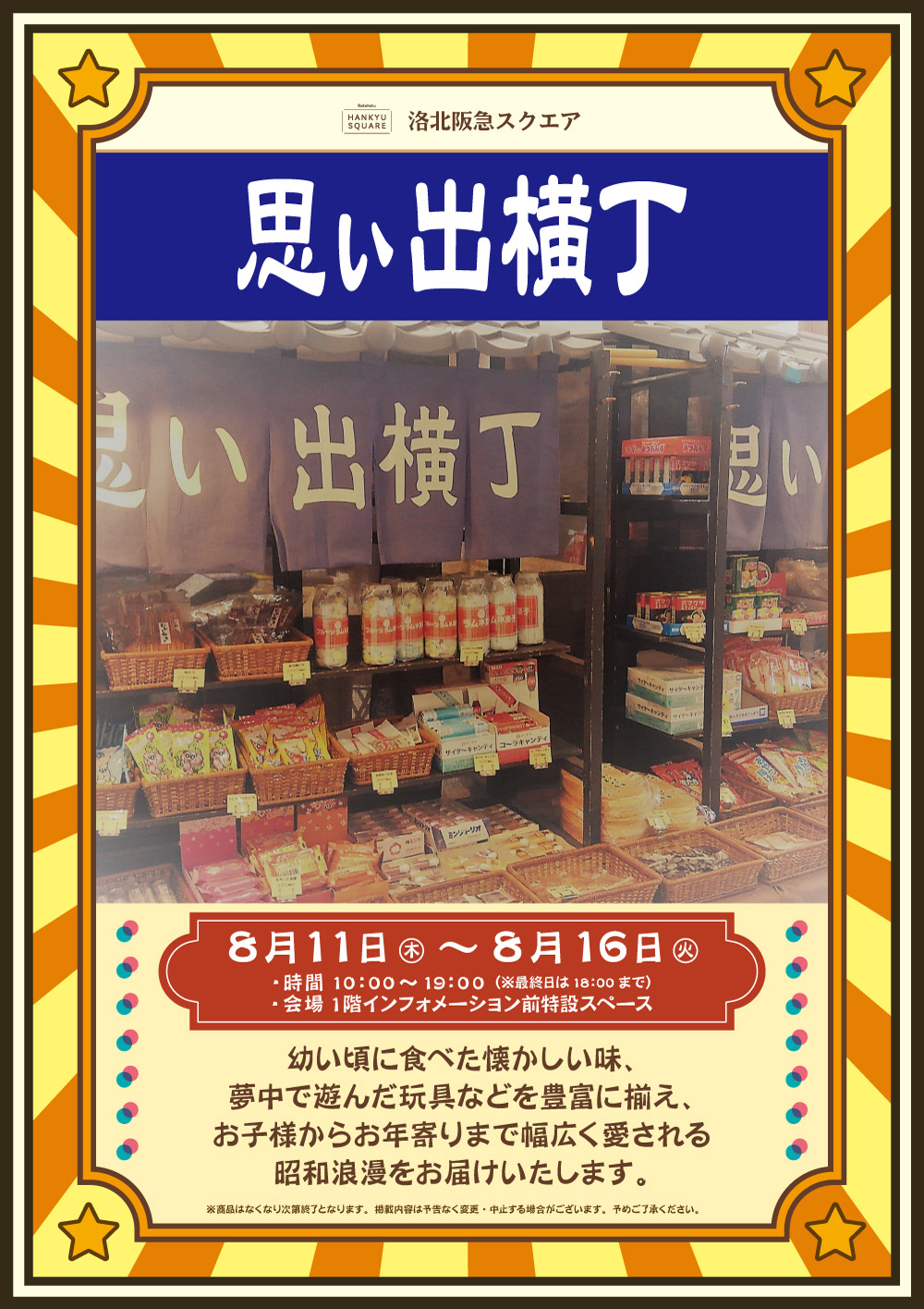 思い出横丁 2022.08.11~2022.08.16 『思い出横丁』 期間 8/11(木)~8/16(火) 時間 10:00~19:00(※最終日は18:00まで) 会場 1階インフォメーション前特設スペース 幼い頃に食べた懐かしい味、夢中で遊んだ玩具などを豊富に揃え、お子様からお年寄りまで幅広く愛される昭和浪漫をお届けいたします。 SNSでシェアする Tweet Tweet 一覧へ戻る