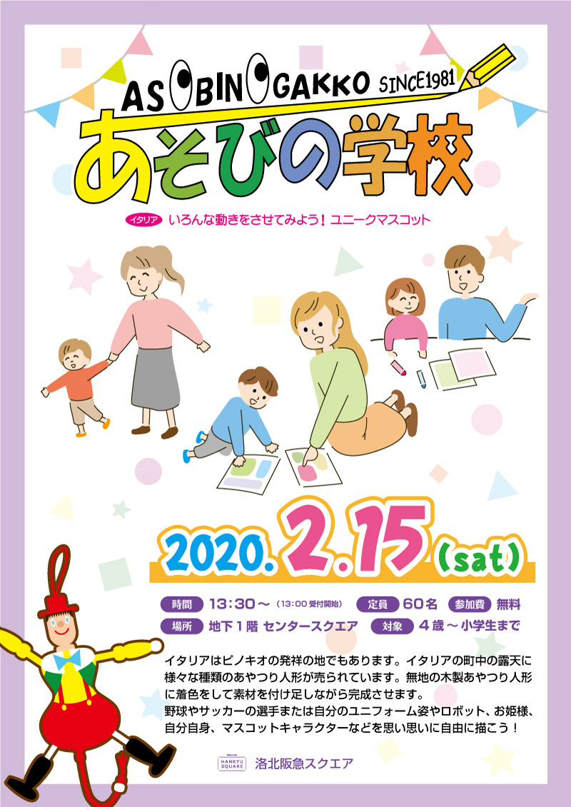 あそびの学校 2020.02.15 世界の教材【イタリア】 いろんな動きをさせてみよう!ユニークマスコット! イタリアはピノキオの発祥の地でもあります。 イタリアでは町中の露店に様々な種類の あやつり人形が売られています。 無地の木製あやつり人形に着色をして素材を 付け足しながら完成させます。 思い思いに自由に描こう!! 【受付・人数】 13:00より地下1階センタースクエアにて 先着60名様 【参加費用】 無料 【対象年齢】 4歳~小学生まで 【開催場所】 地下1階 センタースクエア SNSでシェアする Tweet Tweet 一覧へ戻る