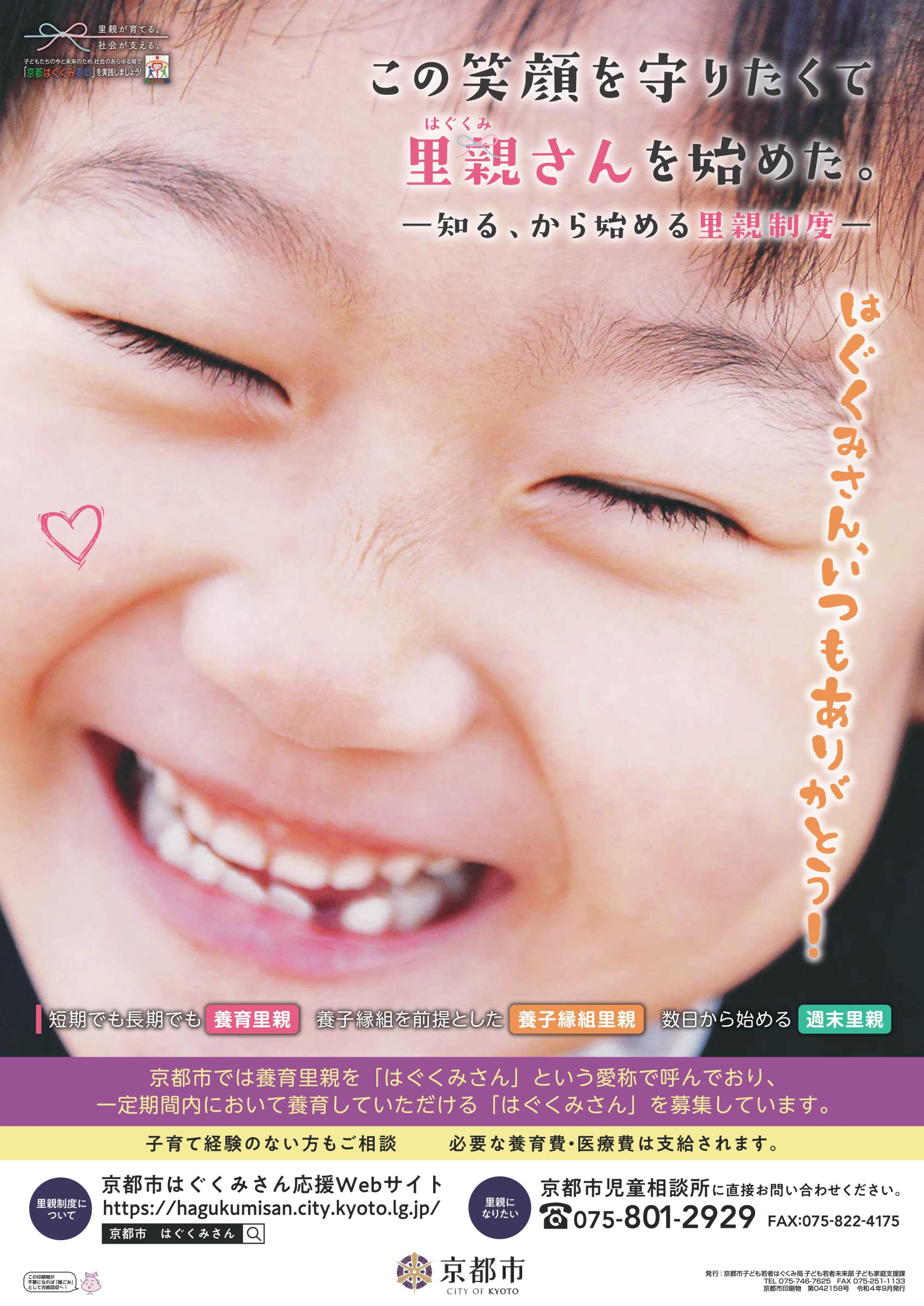 知ってほしい愛ある制度里親さん 2023.07.24~2023.07.26 7月24日(月)・26日(水) 13:00~18:00 1階インフォメーション前特設スペースにて ~知るから始める里親制度~を開催いたします。 養育里親・養子縁組里親・週末里親など 京都市では養育里親を「はぐくみさん」という愛称で よんでおり、一定期間内で養育していただける はぐくみさんを募集しております。 ぜひこの機会にお越しくださいませ。 SNSでシェアする Tweet Tweet 一覧へ戻る