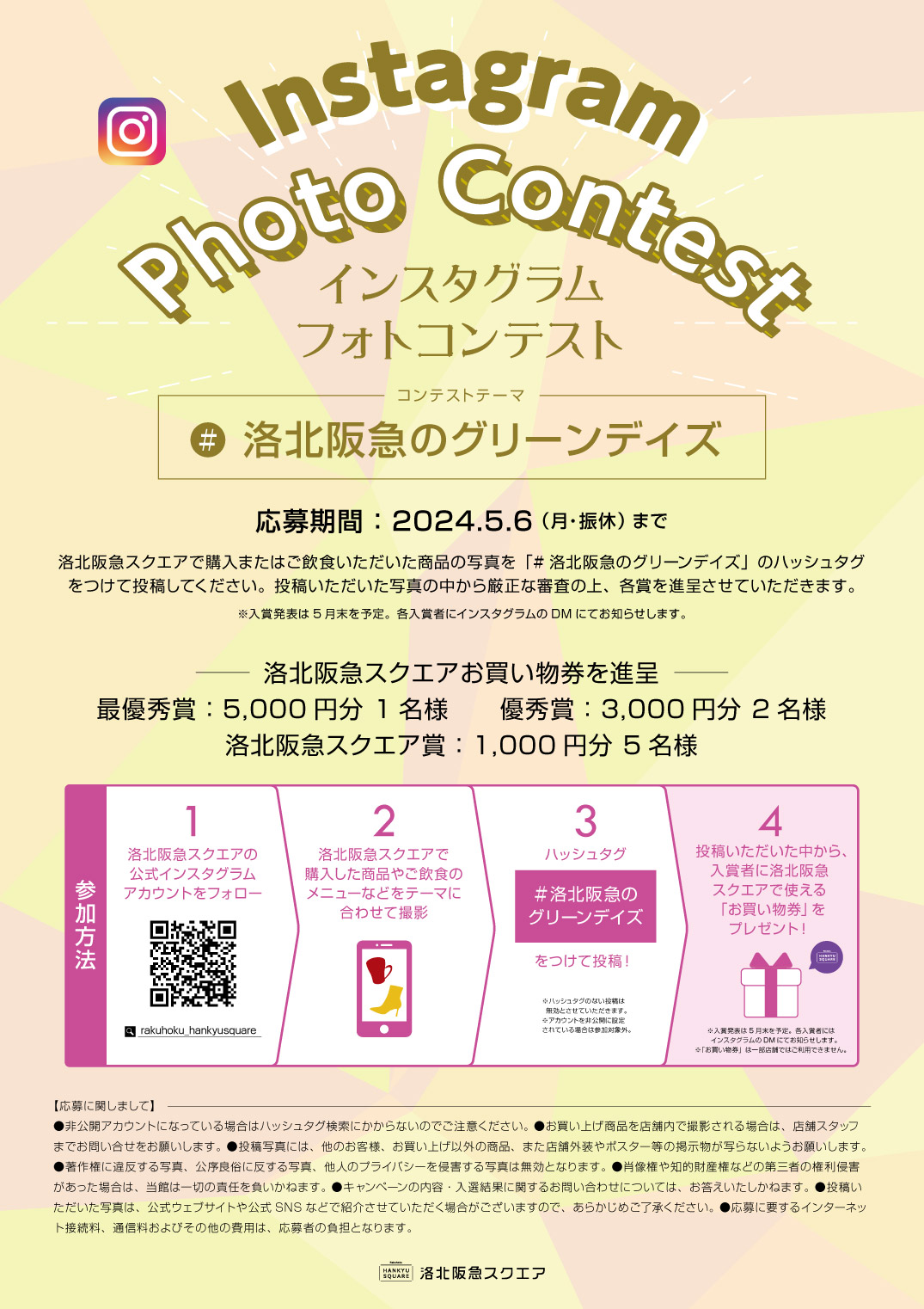 洛北阪急スクエアで購入またはご飲食いただいた商品の写真を「#洛北阪急のグリーンデイズ」のハッシュタグをつけて投稿してください。投稿いただいた写真の中から厳正な審査の上、各賞を進呈させていただきます。