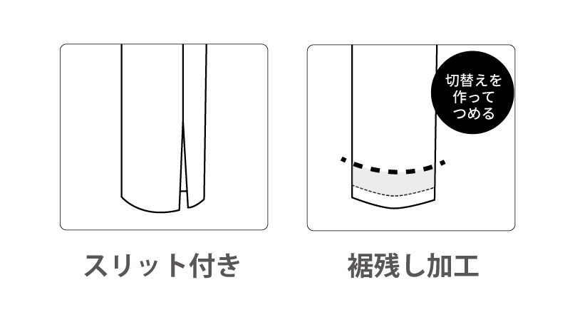 スリット付きのパンツや、ダメージジーンズの裾の風合いを残す丈つめ(裾残し加工/ダメージ残し)や、裾にファスナーが付いているパンツ、裾にゴムが入ったものやリブがついているもの、ドローコード付きのパンツなど、裾にデザインがあるパンツも裾上げができます。