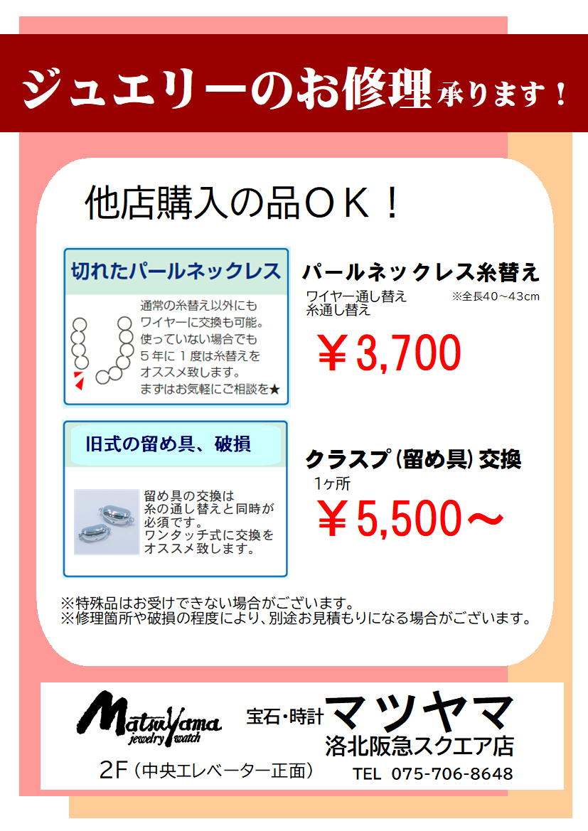 対象:チェーン切れ修理(ロー付)、指輪のサイズ直し、パールネックレス糸・ワイヤー替え
