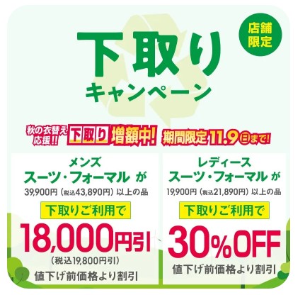 下取りキャンペーン 【他社製品でもOK】【傷ありでOK】【クリーニング未でもOK】 ご不要になったスーツ、フォーマル、ジャケット、スラックス等を 店頭にお持ちくださいませ。 お持ちいただいたアイテム1点につき、多品種に使えるクーポン券1枚で下取り させていただきます。 ※下取り品のお引取りはお客様1回につき5点までとさせていただきます。 詳しくはAOKIのHPをご覧くださいませ。
