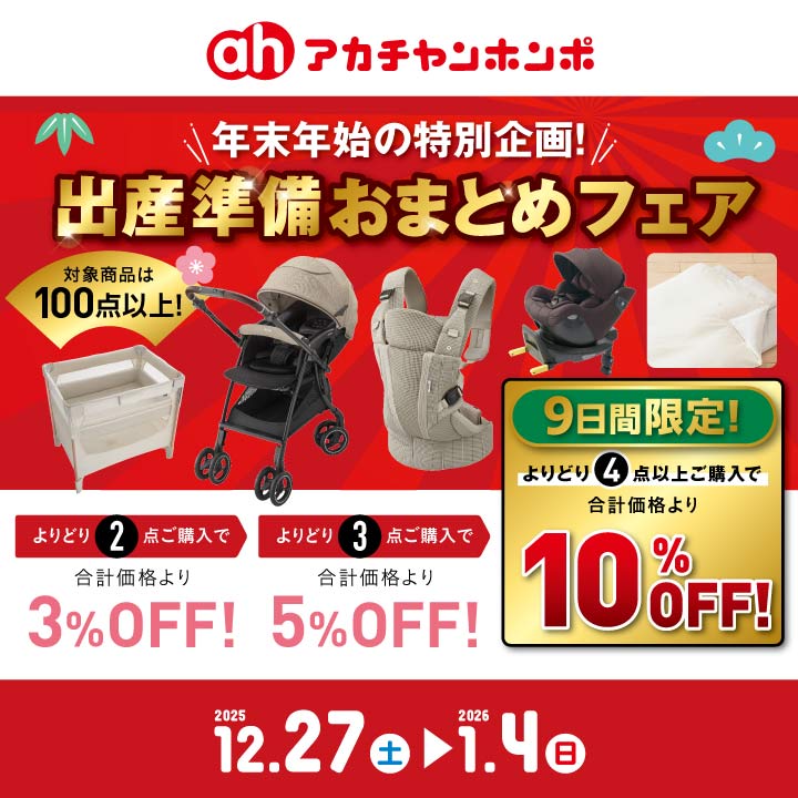 12/27(土)~1/4(日)の9日間限定!ベビーカー、チャイルドシート、抱っこ紐、ベビーラックなどの対象商品をよりどりでご購入いただくと、最大10%OFF◎一部商品にはアカチャンホンポポイントのプレゼントも!人気の抱っこ紐やラック、おふとんセットなども多数取扱い中です♪