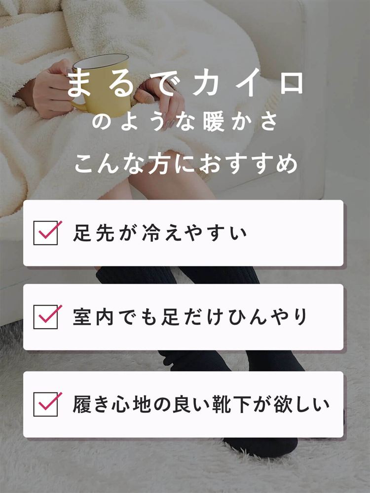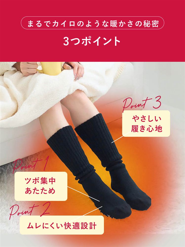 ツボ部分にのみ発熱糸を使用し、その他部分をパイル地にすることで蒸れにくく靴下全体が程よく暖かくなり心地よく履くことができます。