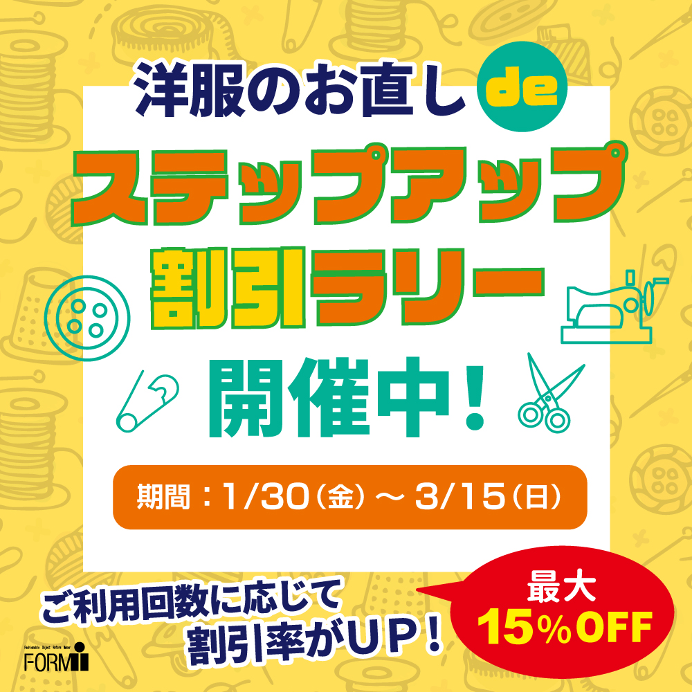 【リフォームブティック 洛北阪急スクエア】では、洋服のお直しが最大15%OFF!になる『ステップアップ割引ラリー』を開催!
