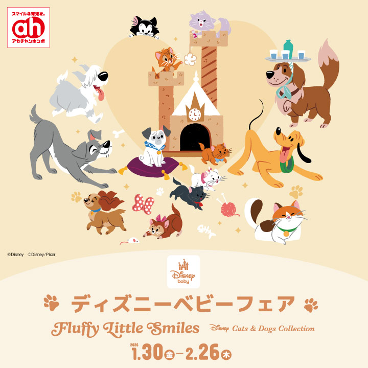 1/30(金)~2/26(木)の期間、ディズニーベビーフェア開催! 2/22の猫の日にあわせ、ディズニーのCats&Dogsがプレオールやモンキーパンツ、母子手帳ケースに大集合♪ この他、お名前シールスターターセットや、くつの左右がわかる絵合わせシールなどの入園準備におすすめなアイテムも◎ フェア期間中は、掲載の商品を含む3,300円以上のお買い上げでステッカーをプレゼント!(全店計5,000枚限定)