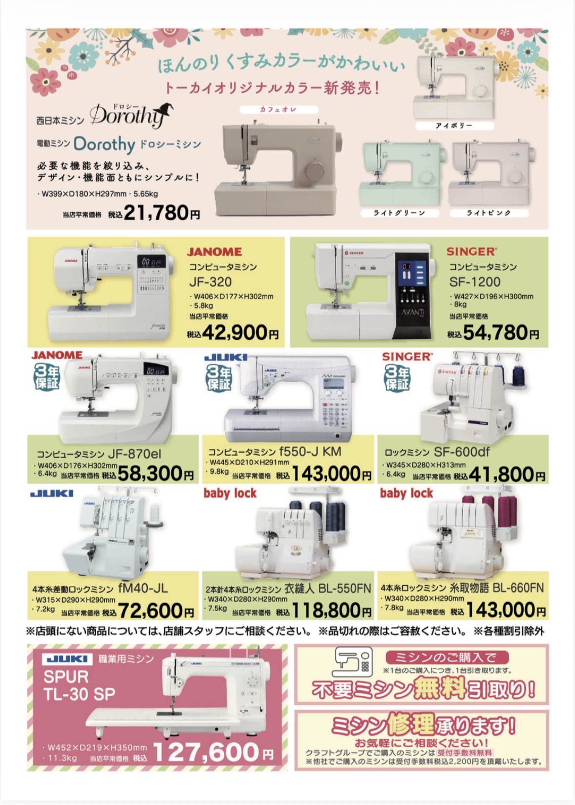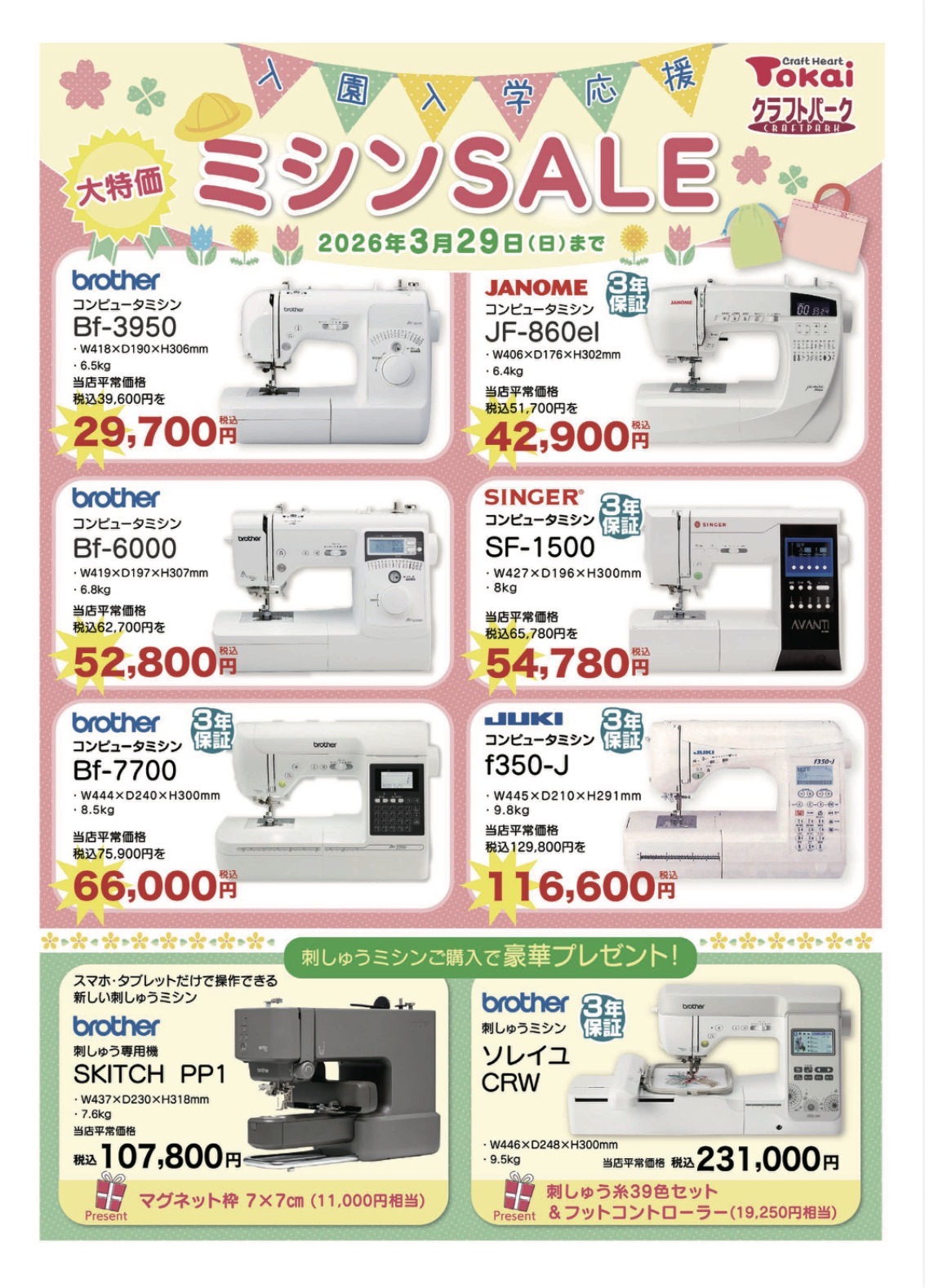 ミシンのご相談はぜひスタッフまで 「入園入学グッズを作るためにミシンを購入したい」「そろそろミシン買い替え時かも…」とお考えの方へ、ミシンセールを開催中です。 期間中、当店人気のコンピュータミシン6台を特別価格でご提供。初心者の方はもちろん、ステップアップを目指す方までおすすめできるラインナップとなっています。 ミシンのお悩みごとは、ぜひクラフトハートトーカイスタッフまでお訊ねください! ※各種割引対象外となります。