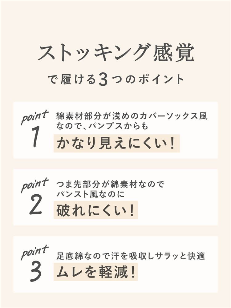 皆様こんにちは♪ いつもご来店いただきありがとうございます♪ 去年大人気だったソックスが今年も入ってきました♪ 足底は綿混素材なので、汗ばむ季節も爽やかな履き心地です! そしてなんとつま先にも綿素材を使用! ストッキングで起こりがちな破れの心配もないです! 一見カバーソックスにも見えるデザインなのでパンプスと相性抜群です♪ またカラバリ豊富にご用意してます!! 皆様のご来店お待ちいたしております♡