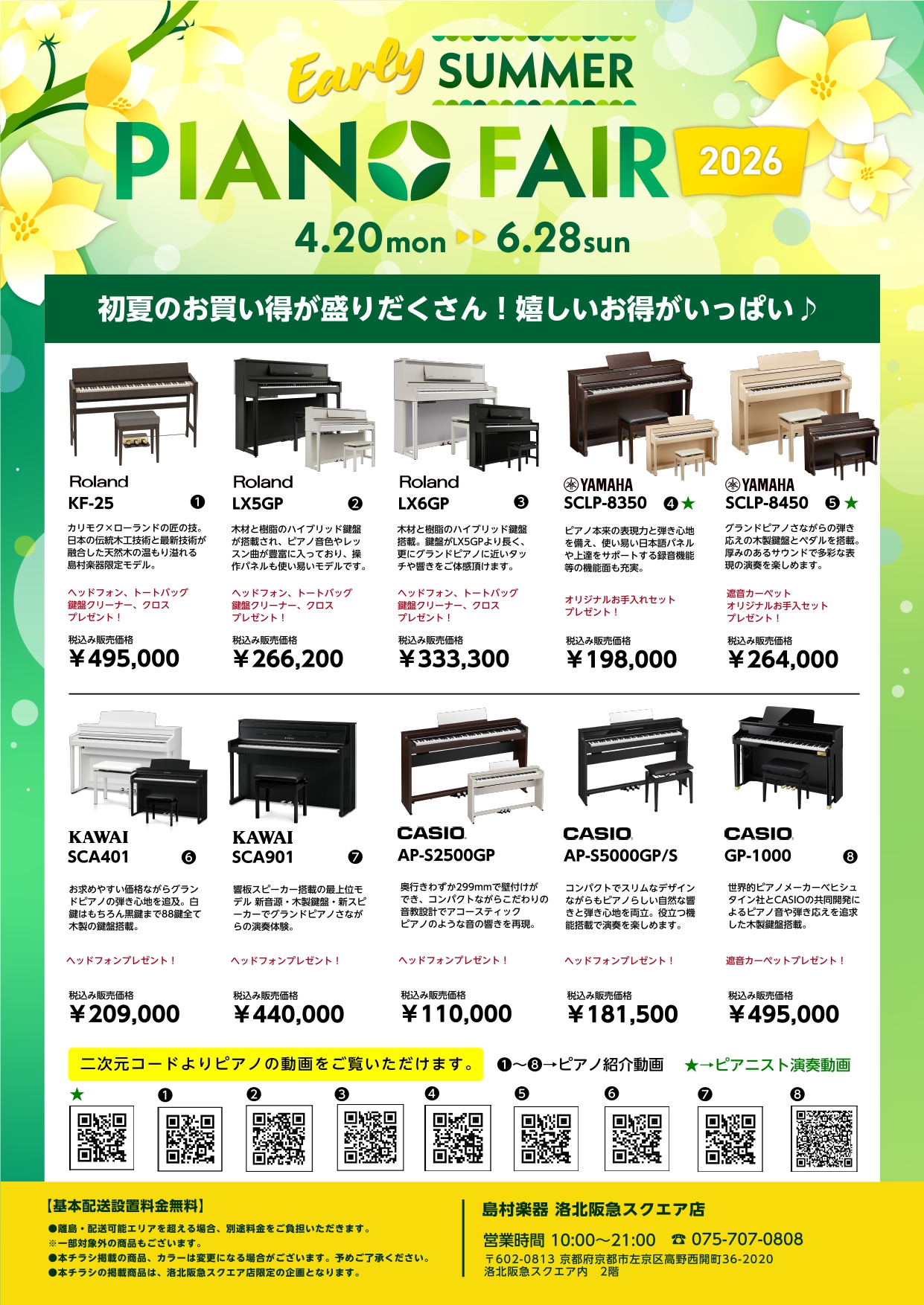 電子ピアノをお探しの方必見! 島村楽器 阪急洛北スクエア店では、4/20(月)~5/6(水)の期間 EarlySummer PianoFair 2026を開催いたします! 初めての1台から本格派モデルまで、実際に弾いて比べながらお選び頂けます♪ 専門スタッフがご相談も承りますので、ぜひこの機会にご来店くださいませ スタッフ一同、皆様のご来店を心よりお待ちしております♪