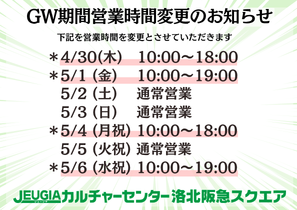 ゴールデンウィーク期間中下記の通り、営業時間を短縮させていただきます