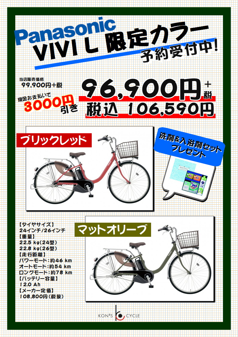 得々情報っ!! Panasonic VIVI L限定カラー ブリックレッドとマットオリーブ が、、、 限定カラーなのに! 洗剤&入浴剤セットも付いてるのに!! 更に現金お支払いで3000円引き!! 8月発売! 現在予約受付中っ 軽い軽い軽いが売りのVIVI Lを ぜひこの機会にGETしてくださいっ