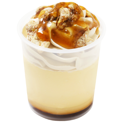 メイプルシュガーの香り豊かなプリンにメイプル風味のクリームを乗せて、とろけるメイプルソースとキャラメリゼしたクルミをトッピングした秋らしいデザート。