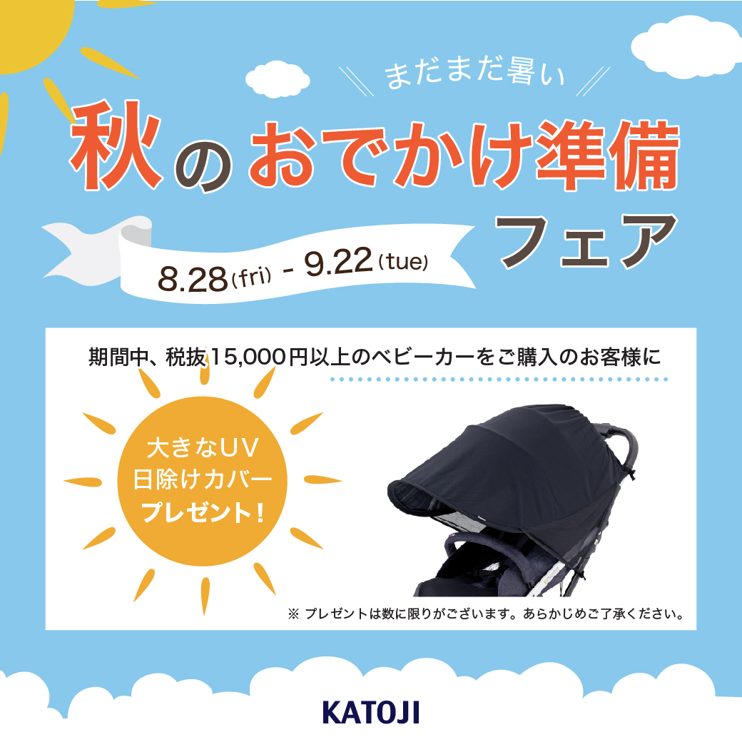 \秋のお出かけ準備フェア/ 税抜15,000円以上のベビーカーをお買上げのお客様に 【大きなUV日よけカバー】をプレゼント中◎ \nuna同時購入キャンペーン/ 対象商品をご購入時に割引キャンペーンを 開催しています! KATOJI京都店ブログ ▶イベント情報