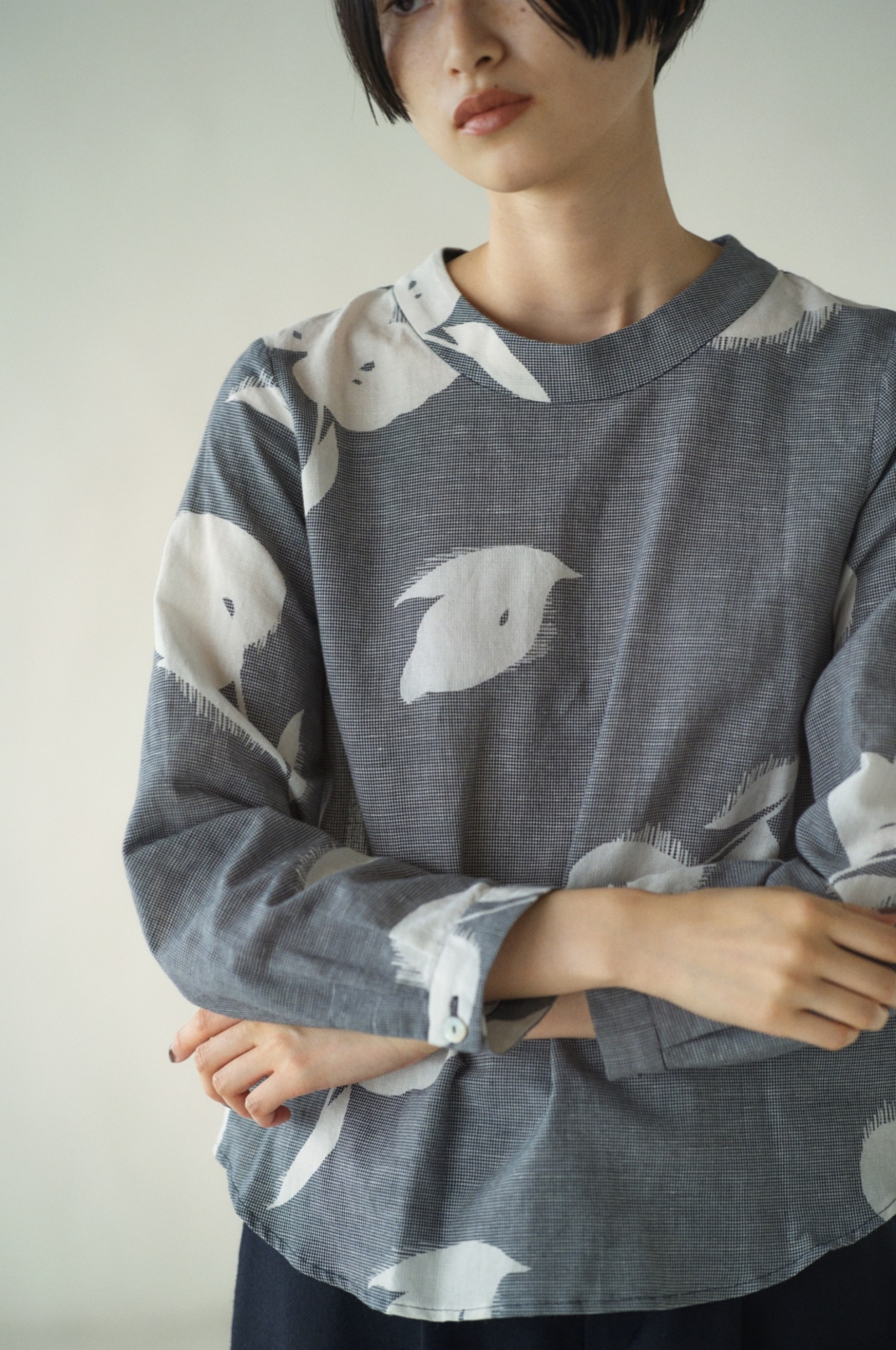 日本でたった一軒がつなぐ技 マンガン染で仕立てたシャツ 千鳥柄に描いた沙羅の木の花にも動きをつけ 古典的な表現から抜きん出た パラスパレスらしい一枚です 千鳥マンガン染沙羅の木柄シャツ ¥27500 サキソニータックパンツ ¥24200