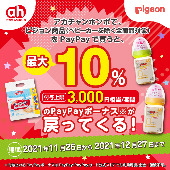 アカチャンホンポで対象のピジョン商品(ベビーカーを除く全商品対象)をPayPayで購入すると「最大10%戻ってくる!」を開催!期間:11/26(金)~12/27(月)※付与上限3,000円相当/期間