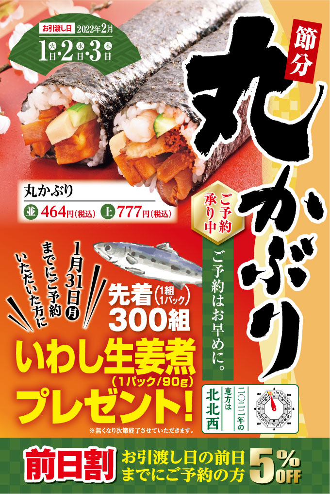 節分 丸かぶりのご予約スタートしております。 CHOJIROの丸かぶり寿司は 皆様の幸福を願って、 神社でご祈祷いただいた海苔を使用しております。 お渡し日の前日までにご予約の方は5%OFF! お早めにご予約ください。 ※丸かぶりは、お持ち帰り品です。 ※お渡し日は2月1日(火)、2日(水)、3日(木)です。