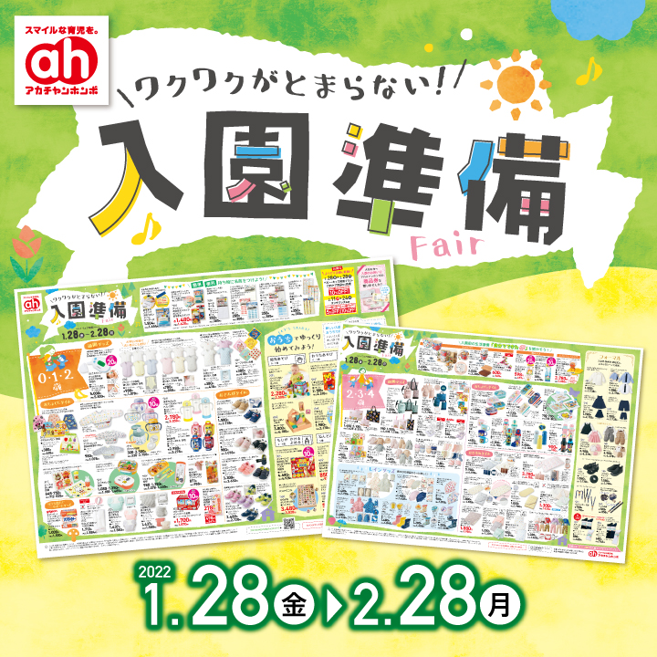 ワクワクがとまらない!「入園準備フェア」開催!通園グッズ、レイングッズ、おしょくじ、おひるね、フォーマル・・・年齢、生活シーンに合わせた入園準備アイテムをご用意!アカチャンホンポで揃えちゃおう!