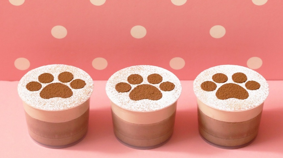 ココアパウダーで描かれたねこの肉球のイラストがキャッチーな「ニャめらかチョコプリン」