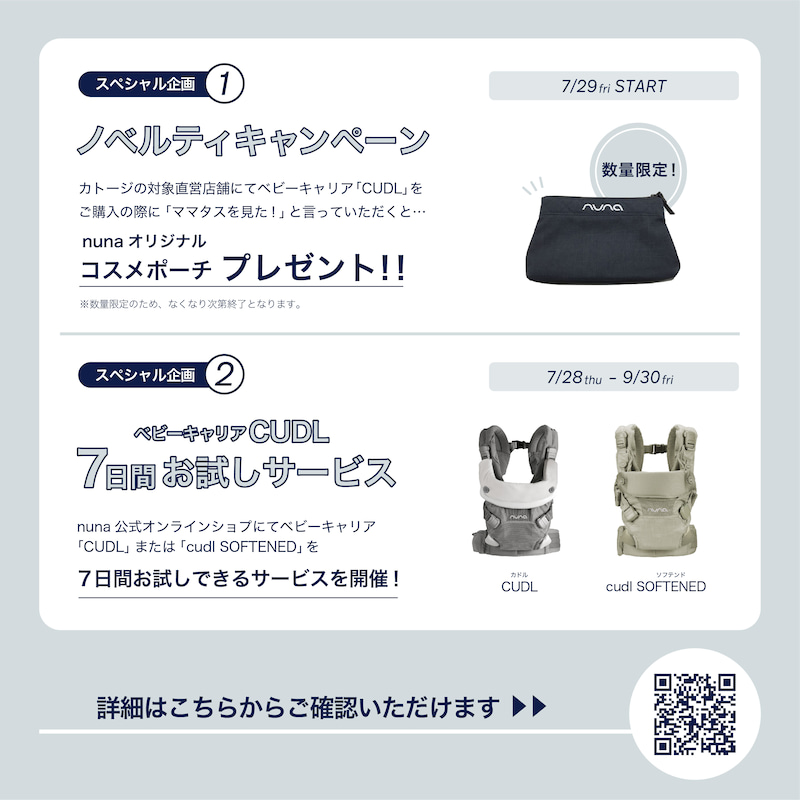 子育てメディア「ママタス」にてnunaのベビーキャリアcudlが 紹介されました☆彡 そこで今回ママタスの紹介動画を見た!というお客様で cudlをご購入のお客様にノベルティのコスメポーチをプレゼント♪ 先着10名様限定となりますのでお早めに☆彡 詳しくは京都店ブログにて!