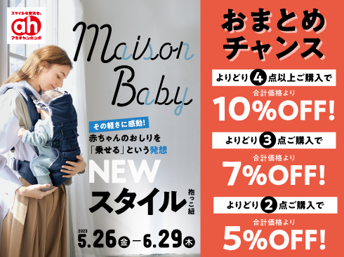 5/26(金)~6/29(木)の期間は、おまとめチャンス! 期間中、ベビーカー、チャイルドシート、抱っこ紐、ベビーラックなどのチラシ 掲載品をよりどりでご購入いただくと最大10%OFFに! 新商品の抱っこ紐「ベビーキャリア ON アンジェレッテ」もよりどり 対象です♪新発想の機能とデザインをぜひお店で体感してくださいね。 詳しくはチラシをご覧ください。この機会をお見逃しなく♪