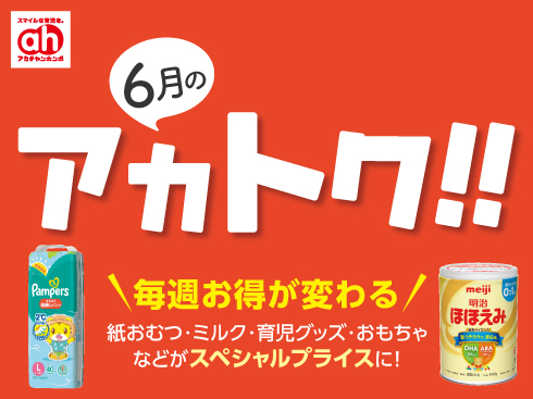 6月のアカトク!!紙おむつ・粉ミルク・おもちゃ・育児雑貨など、 週替わりでお買得!スペシャルプライスのアカトクを要チェック! いつも使っているあの商品をお得にゲットしよう♪ 本日のお買得はこちらから