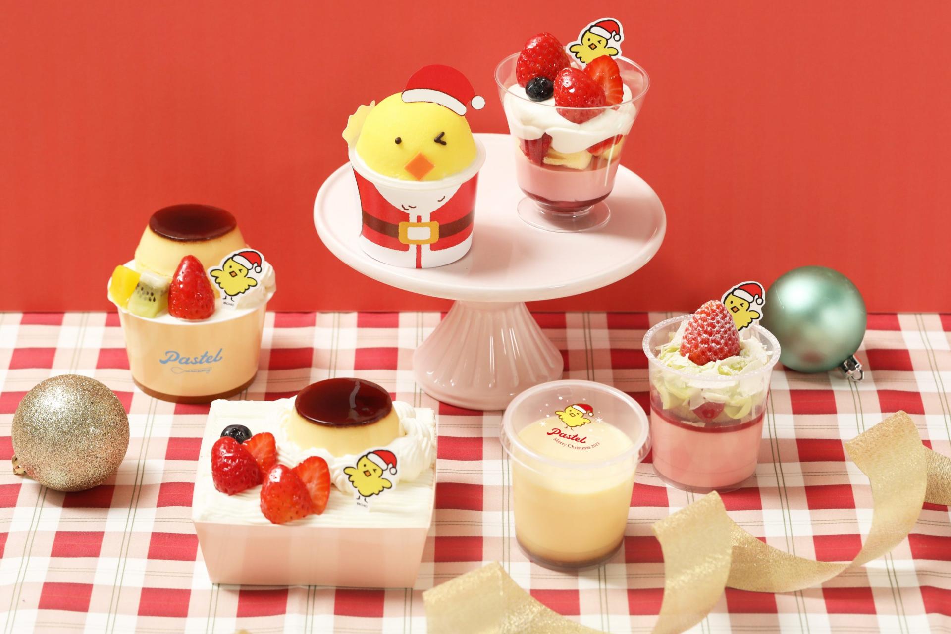 このたび、「パステル」らしいスイーツでホリデーシーズンをお楽しみいただきたいという想いから、「パステル」の公式キャラクター「ぷりにゃん」の相棒「タマコ」がサンタクロースに変身した『サンタ タマコプリン』や、看板商品『なめらかプリン』のカップの蓋に「サンタ タマコ」をデザインした『クリスマス なめらかプリン』のほか、「サンタ タマコ」のピックを飾った『なめらかプリン ア・ラ・モード クリスマス』、『クリスマスショートケーキプリン』、『苺のブランマンジェパフェ』、『苺のプリン ア・ラ・モードケーキ』もご用意いたしました!