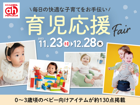 11/23(木・祝)スタート!アカチャンホンポより育児応援Fairのお知らせ! 寒い季節のぽかぽかあったかお風呂グッズやスリーパー、これからやってくるお正月におすすめのキャラクターカイトやかるたも! 0歳~3歳頃のベビー向けのアイテムを、シーンにあわせてご紹介。 紙おむつや粉ミルクなど、毎週お得が変わる!大特価「アカトク」も開催中。 毎日の育児を楽しく快適に!アカチャンホンポの育児応援Fairをぜひチェックしてくださいね。