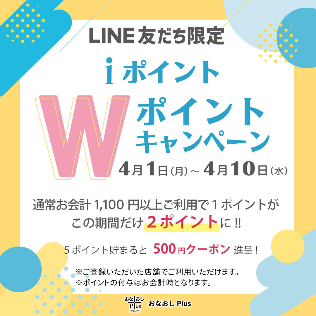 おなおしPlus(プラス)LINE公式アカウントの【LINE友だち限定】で、洋服・バッグのお直しご利用の方に、ⅰポイント”Wポイントキャンペーン“を実施しております!当日、LINEのお友だち登録をしていただいた方もWポイント対象です♪