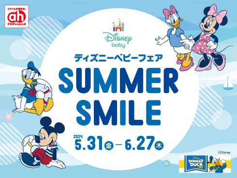 ディズニーフェア開催! 肩ボタン付きでお着替えしやすい総柄の半袖ロンパースや、ひらひらかわいいチューリップハット、綿100%でふんわりきもちいい肌触りのタオルケットの他、つゆ先が尖っていない人気の「フチまる傘」にディズニー柄が仲間入り◎ お揃いのレインコート・レインポンチョで梅雨を先取りしよう♪