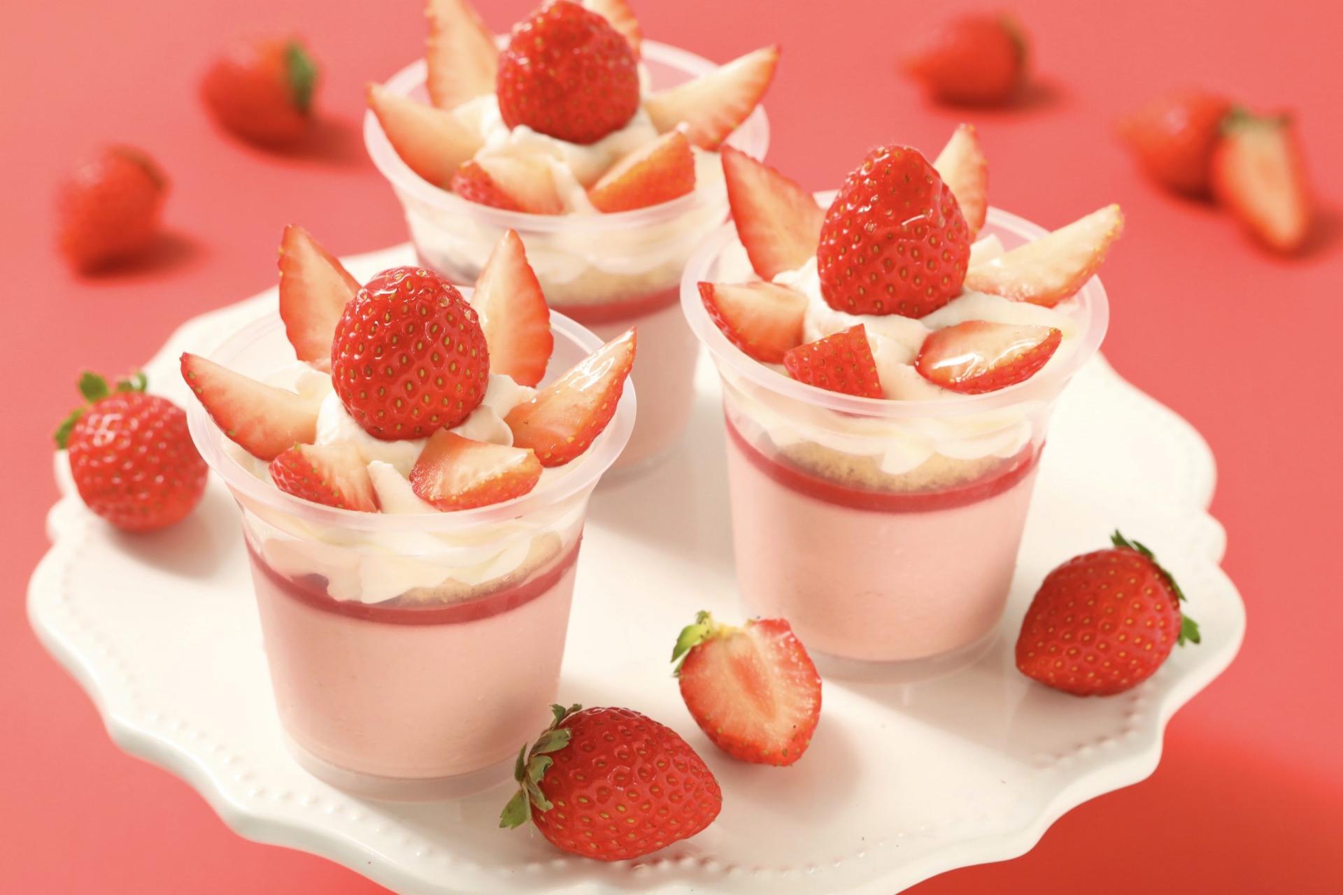 『なめらかあまおう苺プリン』の上に、スポンジ、ホイップクリーム、ふんわり⾷感のバニラムースを重ねました