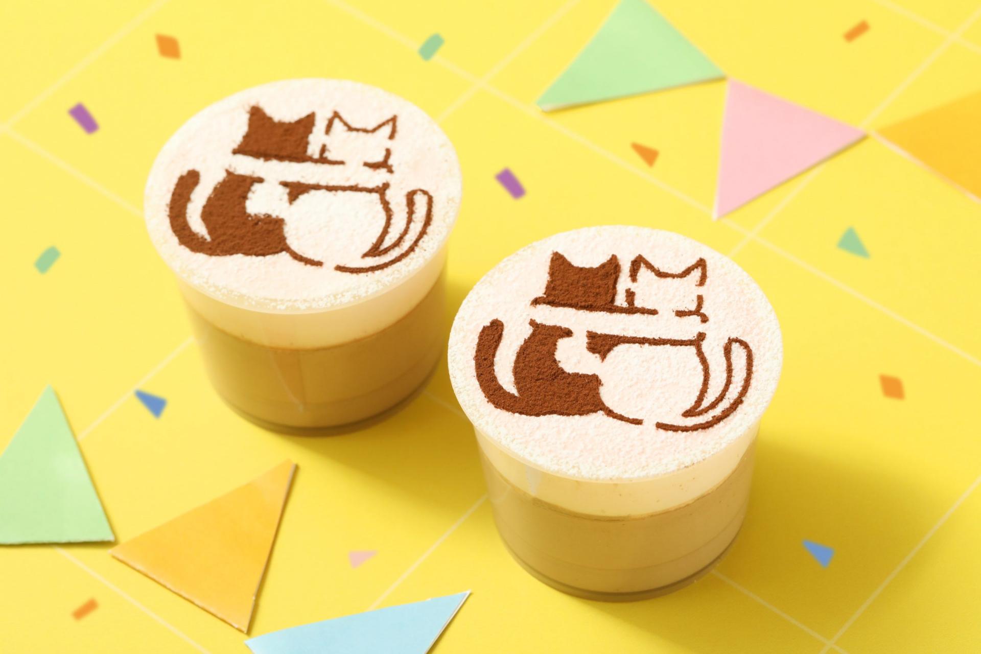 『なめらかショコラプリン』の上にいちご風味のホイップクリームを重ね、ココアパウダーで2匹のねこちゃんのイラストを描きました