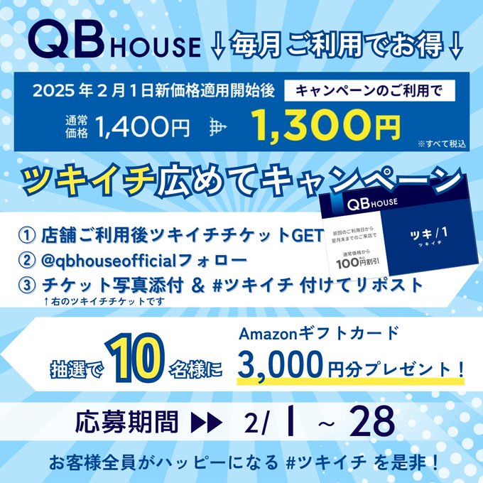 期間中に当店をご利用後、Xにツキイチチケットの写真を添付&リポストしてくれた方の中から、抽選で10名様にAmazonギフトカード3,000円分をプレゼント! ■ツキイチチケットとは? ご来店の翌月末日までに再来店すると、100円割引が受けられるお得なチケットです! ツキイチ習慣で、お客様全員がもっとハッピーに! ぜひ当店をご利用ください!