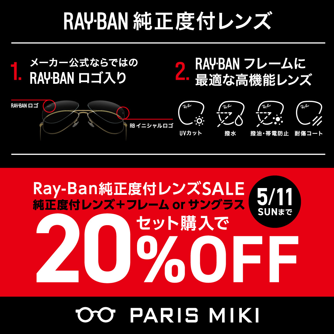 4月18日~5月11日までの期間中、Ray-Ban純正度付レンズをお得に手に入れるチャンス! 対象本体と対象レンズの組み合わせで、ご購入時に20%OFFとなります! この機会にぜひ「Ray-Ban」のロゴ入りレンズで、あなただけのオリジナルRay-Banを作りませんか? 詳細は店頭スタッフまでお問い合わせください。