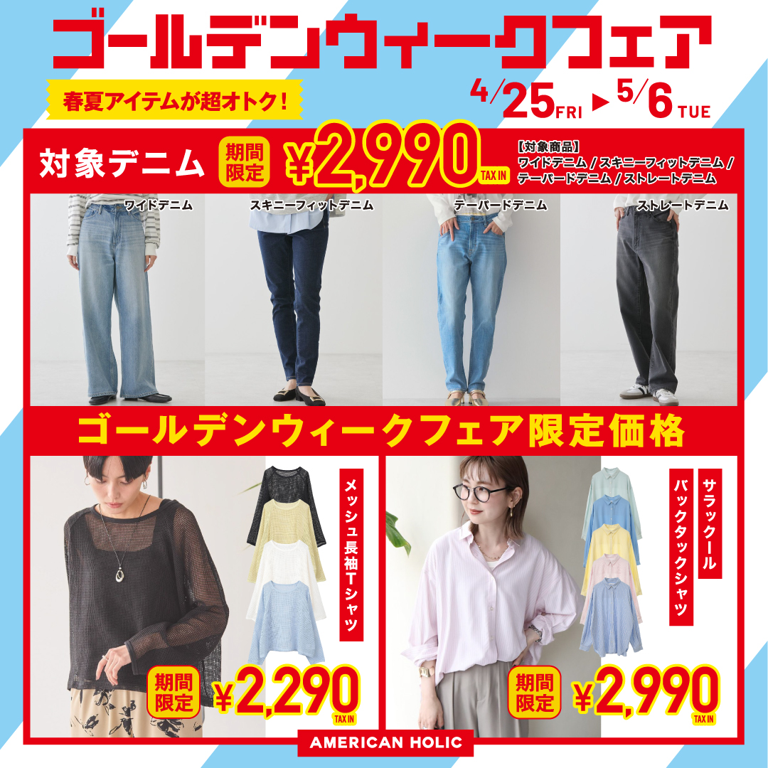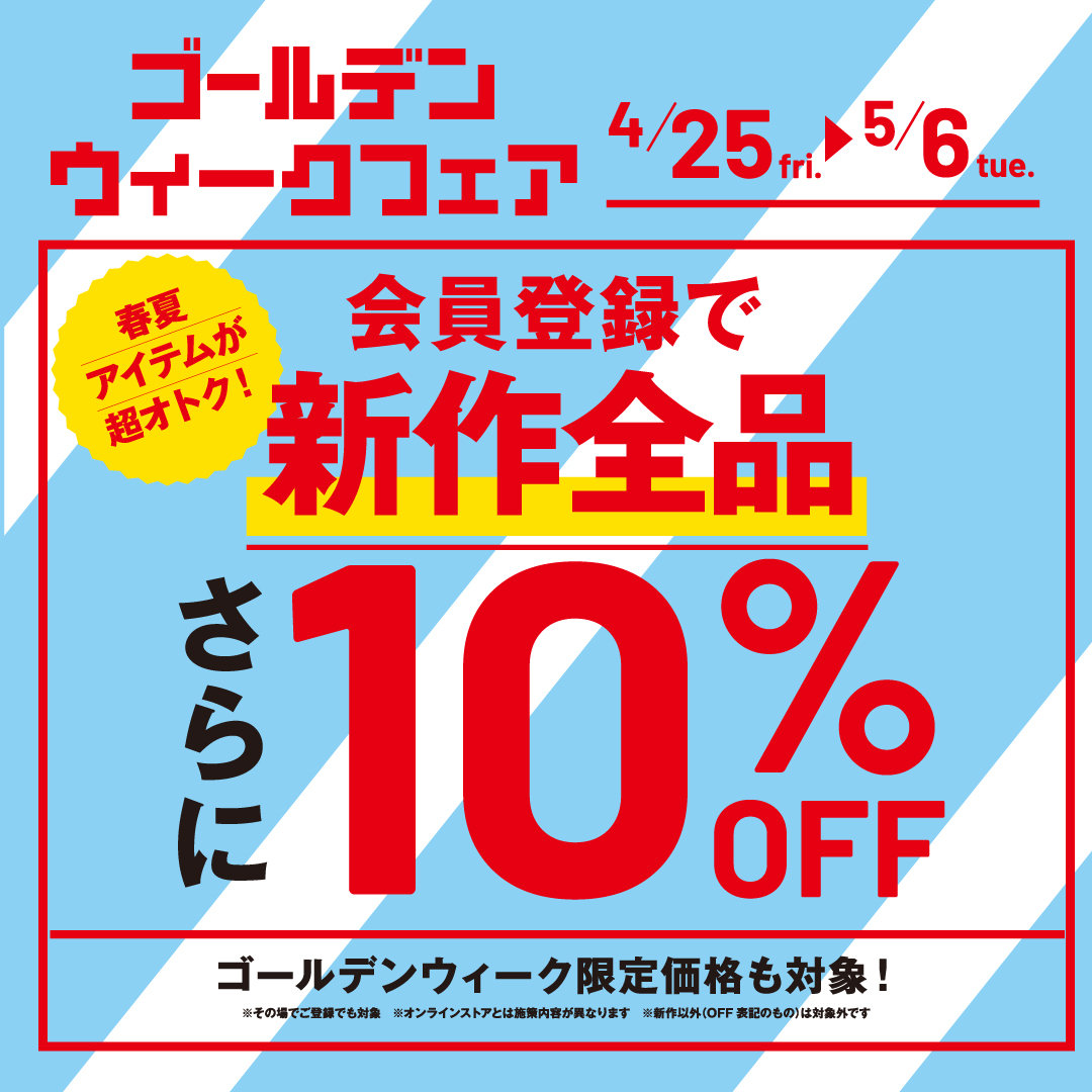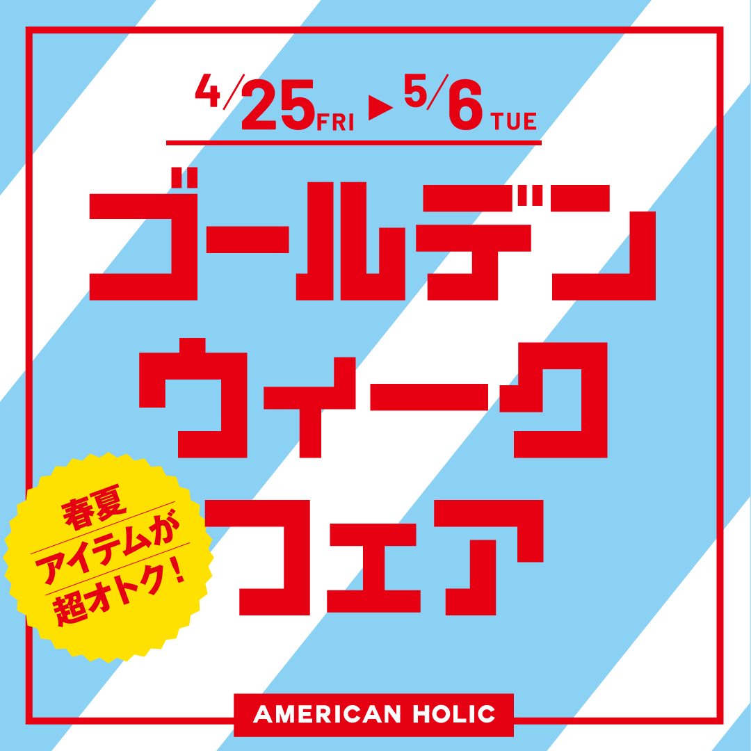 いつもAMERICANHOLICをご利用いただきありがとうございます。 4/25(金)~ 5/6(火)GWフェア開催いたします。 期間限定アイテム、さらにお安くなったアイテム 沢山ご用意してお待ちしております。 ★さらに、会員登録で新作全品10%OFF ・その場で登録でも対象 ・新作以外(OFF表記のもの)は対象外です ぜひ店頭にお立ち寄りください。 洛北阪急スクエアstaff snap こちらをクリック☝