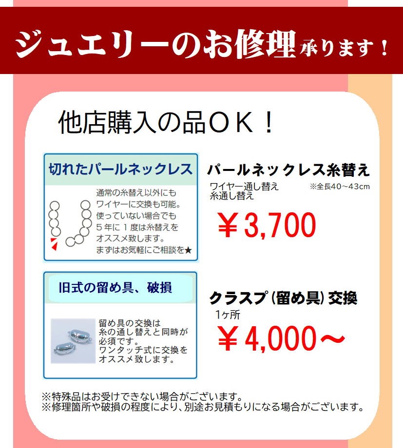 対象:チェーン切れ修理(ロー付)、指輪のサイズ直し、パールネックレス糸・ワイヤー替え
