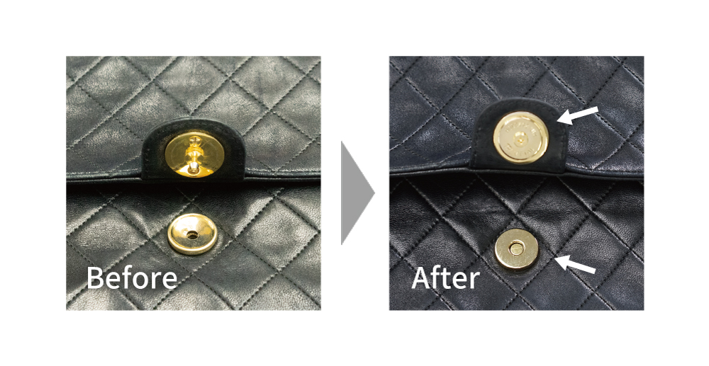 新しく取り付けるマグネットホックは汎用品となる為、ブランドロゴは無くなります。予めご了承ください。