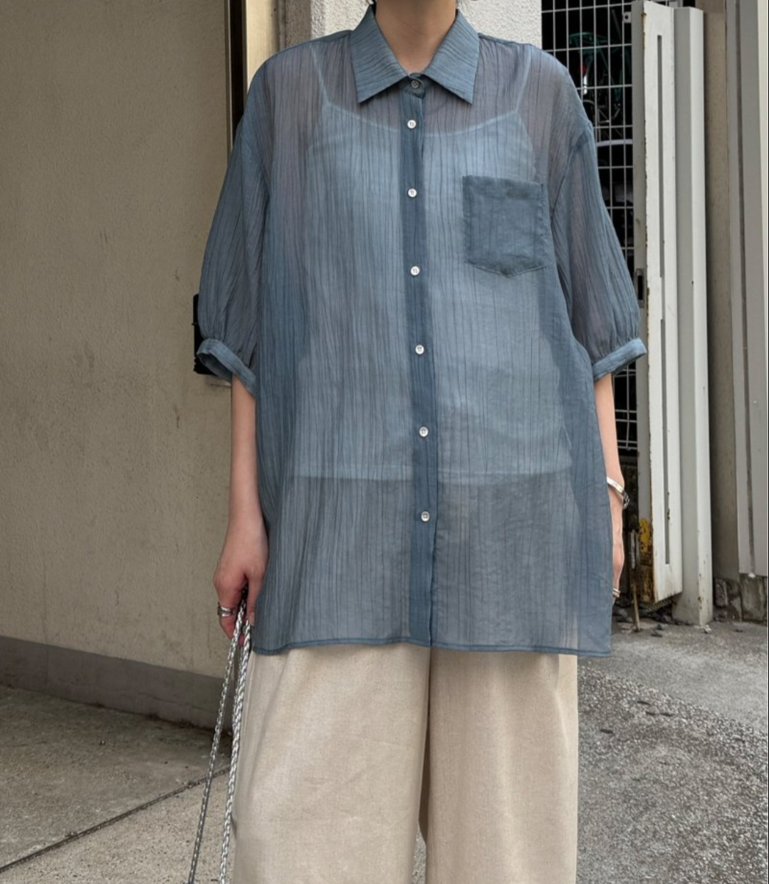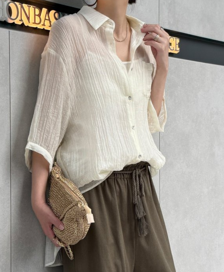 LBCの大人気ブラウスのご紹介です♪ シャリっとした肌触りが心地よい楊柳(ようりゅう)シアー素材を使用した5分袖シャツです。 風を通す軽やかな着心地と、体から離れるゆったりシルエットで、暑い季節も快適に。 カラーはホワイト、ブルー、チャコール、マスタード、ブラックの5色。 ぜひご覧下さいませ♪ 楊柳五分袖シアーシャツ¥3990(税込¥4389)